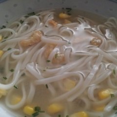 - After 20min, add the dried shrimps and wait another 5-10 minutes, then bring water to a boil, add the noodles and wait 2 min until they're cooked. Throw in the corn and scallions, wait for it to warm up to soup temperature.